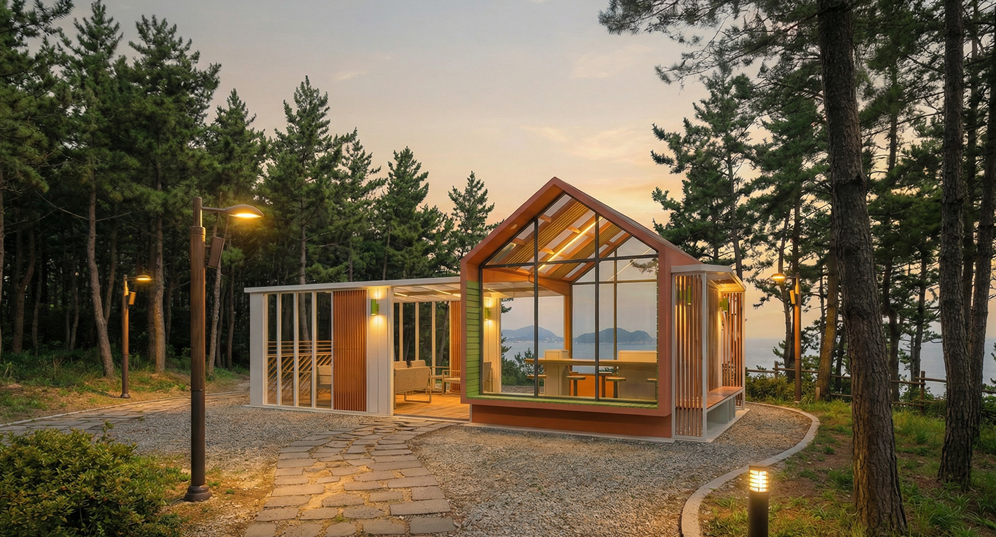 듀얼 하우스 파빌리온 (Dual House Pavilion)|PNDP-010 제품목록으로 바로가기 자료 및 바로가기 나라장터 바로연결 도면 다운로드 시공사진 보러가기 기타 두 가지 지붕을 조합한 독창적 구조로, 넓은 글래스 루프와 우드 루버가 채광과 개방감을 강조합니다. 내부는 카페형 좌석과 바 테이블을 분리해 다양한 활동이 가능한 복합 라운지 공간으로 구성했습니다. 제품명 듀얼 하우스 파빌리온 (Dual House Pavilion)|PNDP-010 물품식별번호 24965765 규격 10,000 X 5,000 X 4,075(H) 재질 stl, hard wood, galvanized, polycarbonate,강화유리 듀얼 하우스 파빌리온 (Dual House Pavilion)|PNDP-010 물품식별번호 24965765 규격 10,000 X 5,000 X 4,075(H) 재질 stl, hard wood, galvanized, polycarbonate,강화유리 기타 두 가지 지붕을 조합한 독창적 구조로, 넓은 글래스 루프와 우드 루버가 채광과 개방감을 강조합니다. 내부는 카페형 좌석과 바 테이블을 분리해 다양한 활동이 가능한 복합 라운지 공간으로 구성했습니다. 자료 및 바로가기 나라장터 바로연결 도면 다운로드 시공사진 보러가기